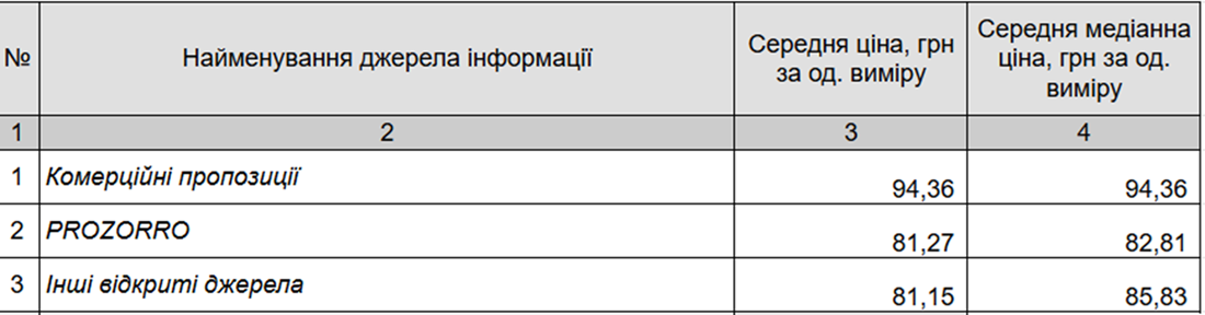 * Середня ціна розрахована на основі цін, що бралися з системи Prozorro, інформації що міститься у відкритих даних та на основі отриманих комерційних пропозицій