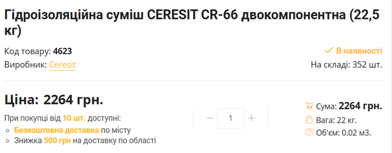 №254 Еластична гідроізоляційна суміш двокомпонентна CERESIT CR-66 (22,5 кг) зазначена — 138,15 грн за кг, тоді як середня ринкова ціна* становить лише 85,59 грн/кг. Переплата по даній позиції становить 38,05%.